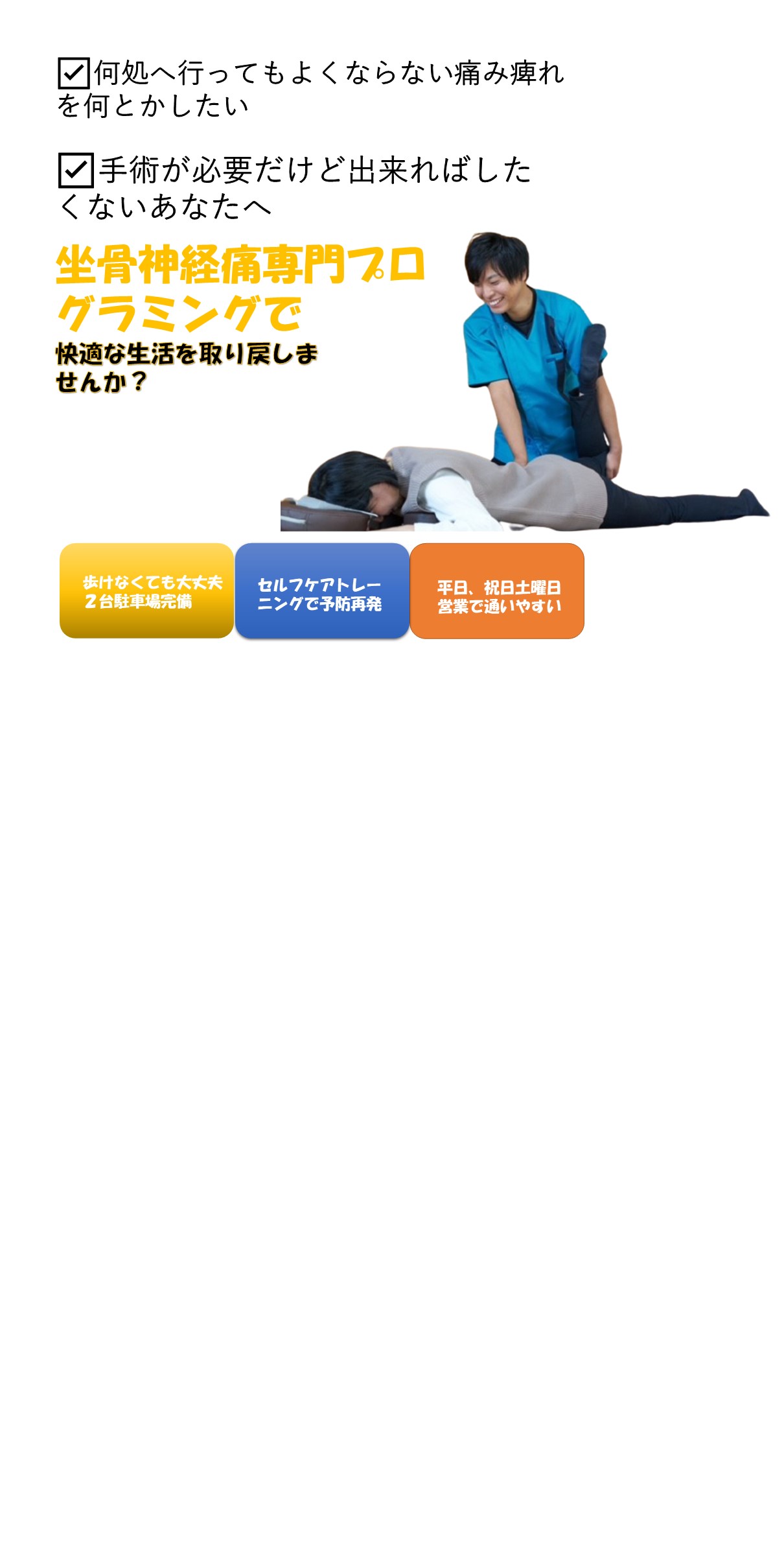 - 2坐骨神経痛の原因が分かってすっきりした。施術で痛みもとれた.
